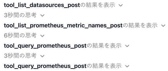 tool_XXXは、mcp-grafanaが提供するツール名です。この時、下記のように動作していました。