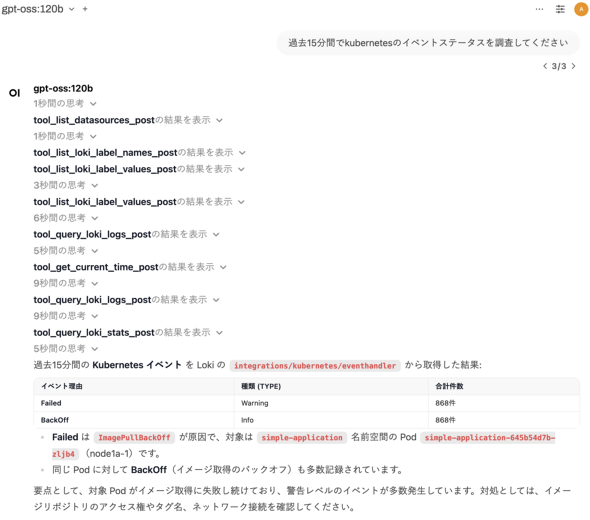 次に、Kubernetesのイベントログを検索してみましょう。新しいチャットを開き、mcp-grafanaとtimeツールを同様に有効にして、下記のように質問してみます。
