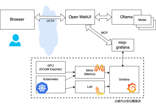 そこで本稿では、gpt-ossを活用するユースケースの一つとして、前回の記事で構築したGPUクラスタ環境にgpt-ossをデプロイし、「Open WebUI」と「mcp-grafana」を連携させ、KubernetesのGPU環境とPodのGrafanaのメトリクス/ログをチャット操作で取得し、AIエージェントによりトラブルシューティングを自動化する手順を紹介します。