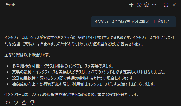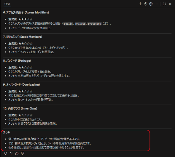 今回は、前回Visual Studio Code(以降、VS Code)からGitHub Copilot(以降、Copilot)に投げた質問「オブジェクト指向についてメソッドやコンストラクタ以外の主な機能を重要度順に教えて。サンプルコードは不要です。」で得られた、その他の回答に注目していきます。まず、その回答を振り返ってみます(図1)。