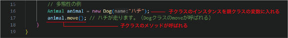 のです。前回の「継承」の例で「多態性の例」とあったコードに少しだけ触れましたが、それが相当します。前回の図から、該当箇所のみを切り出して再掲します(図3)。