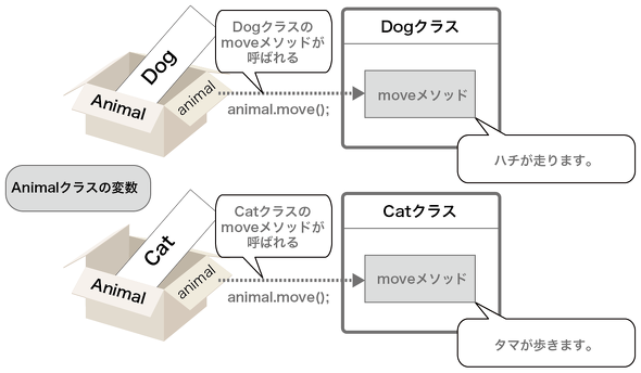 これは、DogクラスとCatクラスの親クラスであるAnimalクラスではmoveメソッドを「〜が移動します。」としていたのに、Dogクラスでは「〜が走ります。」となるようにオーバーライドしたからでした。これにより、moveメソッドをDogクラスとCatクラスで異なる動きにできたわけです。