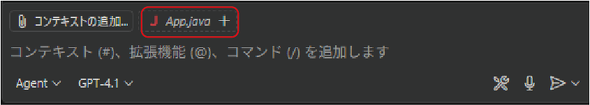 エディタビューにApp.javaが開かれている状態で、プロンプトパネルに「App.java」と正体で表示されていることを確認してください(図7)。もし斜体になっている場合には、ファイル名右の[+]をクリックしてください。