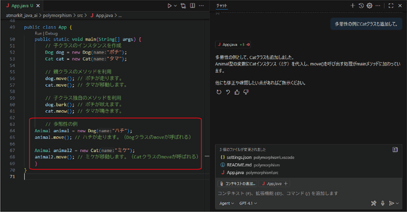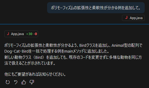 ここで、「多態性の例にCatクラスも追加して。」と投げてみます(図8)。