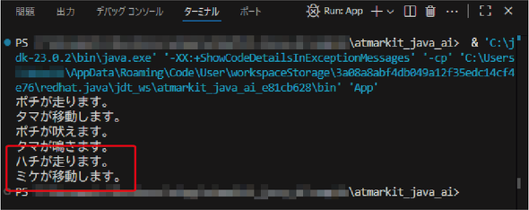 インデントが少しおかしいのですが、既存のコードが削除され、DogクラスとCatクラスのインスタンスを格納する2つのAnimal型変数が宣言されました。実行結果がコメントに表示されてしまっていますが、改めて実行して確かめましょう(図9)。