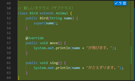 コードのポイントは(1)3つのクラスのインスタンスで、Animal型の配列を作り、(2)それを拡張for文で表示し、(3)Birdクラスのsingメソッドを呼び出す、この3つです。これで、4行結果が表示されているわけです。なお、配列や拡張for文を忘れてしまったという人は、それぞれ第2回、第4回を振り返ってください。