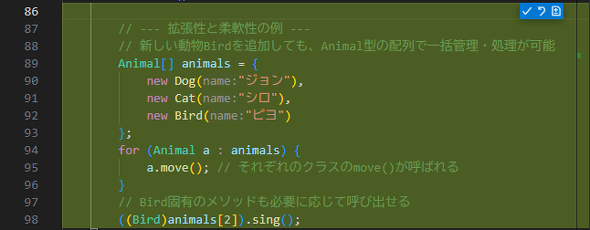 現状の方法だと、(新しいクラスの定義は別として)配列に新しいクラスのインスタンス生成を追加するだけで、拡張for文には全く手を付ける必要はないのです。拡張のしやすさ、変更への追従のしやすさ、これが「拡張性と柔軟性」というわけです。これは、Animal型を受け取る(返す)メソッドを設計する場合にも同じことが言えます。