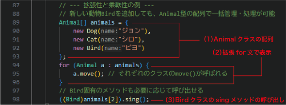 さて、ここで疑問が湧く人もいるかと思います。mainメソッドの冒頭ではDogクラスとCatクラスのインスタンスをそのままDog型、Cat型の変数に入れているので、これでいいんじゃないかと。確かに、それぞれのクラスのメソッドを呼ぶだけなら、わざわざAnimalクラスの変数を使う必要もありませんね。ここで、図2の「ポリモーフィズムの主なポイント」にあった「拡張性と柔軟性」です。この当たりを具体的に示してもらうことで、この疑問を解決しましょう。