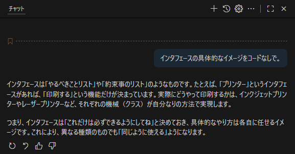 上記でも示された「仕様」を定めるものと示されました。インタフェース自体には具体的な処理は含まれず、メソッドの仕様のみが宣言されているものと読み取れます。特徴が4つ示されましたが、仕様のみを定めるとはいったいどのようなことなのか、これまでと同様に具体的なイメージで示してもらいましょう。「インタフェースの具体的なイメージをコードなしで。」と投げてみました(図16)。