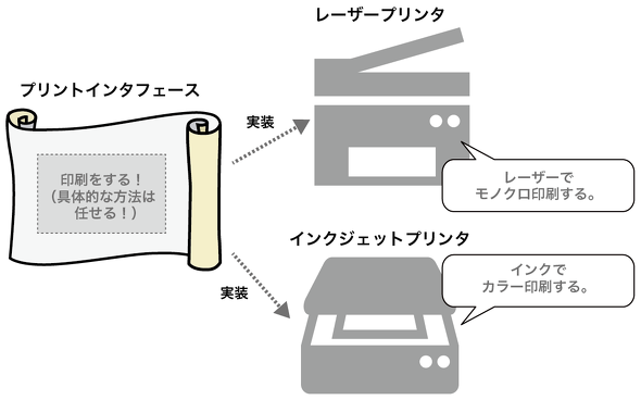 インタフェースを、「プリンタ」で例えてくれました。かなりシンプルな説明で、これでも十分理解できると思いますが、さらに簡略化すると、このような感じでしょうか。