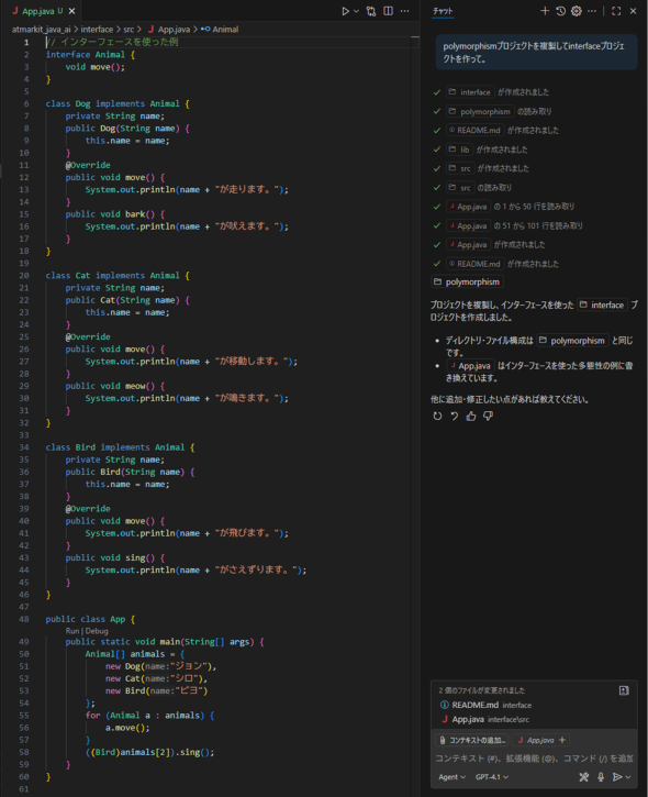 Agentモードになっていることを確認して、「polymorphismプロジェクトを複製してinterfaceプロジェクトを作って。」と投げてみます。すると何と、プロジェクトを複製するばかりか、インタフェースを使ったコードに書き換えてくれました(図18)。