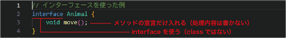 インタフェースの定義では、classキーワードではなくinterfaceを使います。そして、その中にメソッドの定義を入れていきますが、メソッドの処理内容は入れません。インタフェースには、どのようなメソッドがあるかという情報のみを入れていくのは前述の通りです。ここでは、moveメソッドがあることだけを表しています。