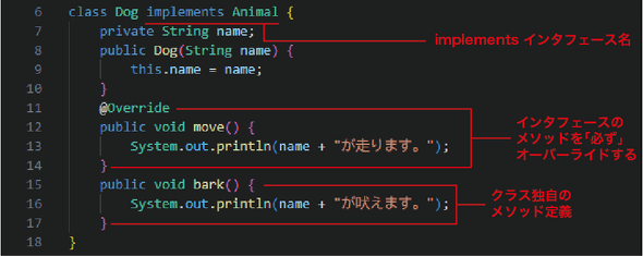 これまでのクラス定義と変わらないように見えますが、クラス名の後に「implements Animal」と続いている点が異なりますね。implements(実装する)とあるように、インタフェースを実装する場合には「implements」キーワードに続けてインタフェース名を指定します。これで、クラスDogはインタフェースAnimalを実装する、なのでmoveメソッドの処理内容を記述する必要がある、ということになります。