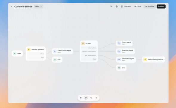 AIエージェントワークフローは複雑化しており、開発者はその動作を明確に可視化する必要がある。Agent Builderは、視覚的キャンパス上で、ノードをドラッグ&ドロップで配置し、つなげることでAIエージェントの処理の流れを構築できる。プレビュー実行、インライン評価設定、バージョン管理もサポートする。