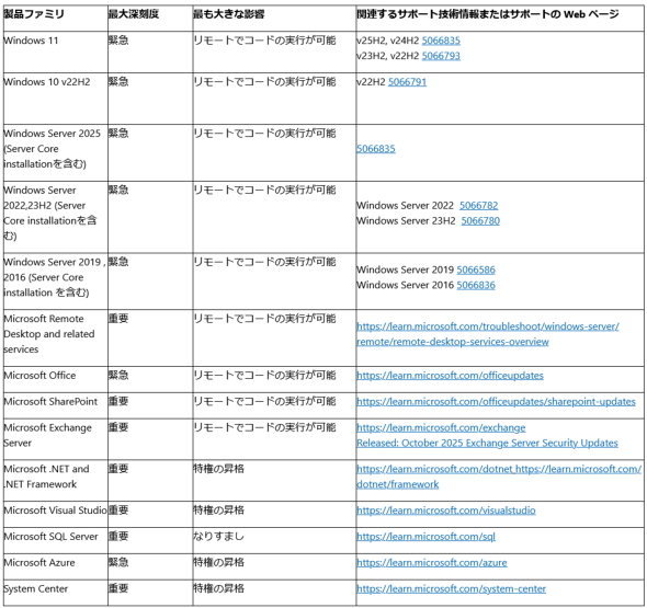 2025年10月のセキュリティ更新プログラム一覧は次の通り。今回の更新では、Windows 11、Office、「Windows Server 2025」「Microsoft Exchange Server」「Microsoft Azure」といった製品が対象となっている。中でもWindowsおよびOffice製品群は「リモートでコード実行が可能」となる緊急レベルの脆弱性を修正している。