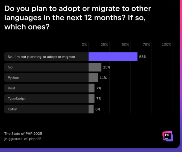 PHP開発者の過半数は、今後1年以内に他の言語を採用したり移行したりする予定はないと回答した。採用や移行を予定している開発者の間では、「Go」と「Python」が最も有力な代替言語となっている。