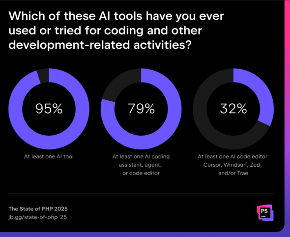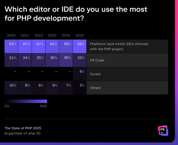 「PhpStorm」と、PHPプラグインを導入した「IntelliJ IDEA Ultimate」を使用しているPHP開発者の割合が2024年調査から10ポイント上昇し、68%となった。「Visual Studio Code」(以下、VS Code)のユーザーシェアは10ポイント以上低下した一方で、新顔の「Cursor」が6%のシェアを獲得した。