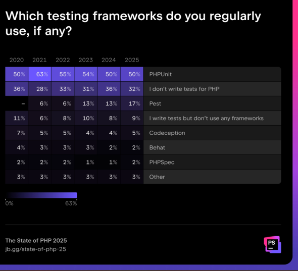 「PHPUnit」が依然として標準だが、「Pest」の使用率が2024年調査から4ポイント上昇して17%に達し、モダンで開発者に優しいテストフレームワークの人気を示している。ただし、開発者の32%はいまだにPHPコードに対してテストを書いていない。