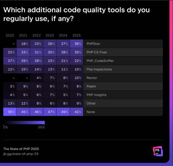 「PHPStan」が使用率を9ポイント伸ばし、初めて首位に立った。「PHP CS Fixer」や「PHP_CodeSniffer」も広く使われている。「Rector」の使用率も着実に上昇している。それでも、回答者の42%はコード品質ツールを定期的に使用していない。