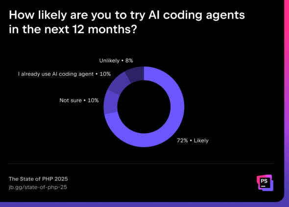 PHP開発者の72%が1年以内にAIコーディングエージェントを試す可能性が高いと答え、「可能性が低い」と答えたのはわずか8%だった。