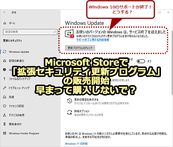 Microsoft Storeで販売されている「拡張セキュリティ更新プログラム」を購入する意味は?2025年10月14日(米国時間)にWindows 10のサポートが終了し、Windows 10に最後の更新プログラムの提供が開始された。以降、Windows 10に対する更新プログラムの提供はされなくなる。