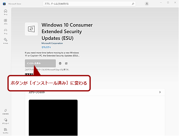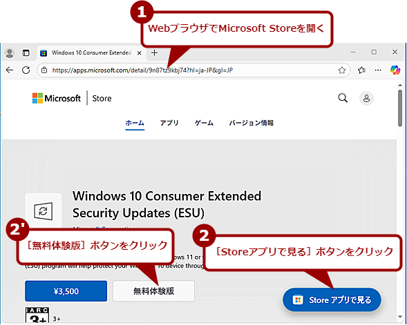 では、実際にMicrosoft StoreでESUを購入するとどうなるのかを試してみよう。原稿執筆時点では、「Microsoft Store」アプリの検索では、ESUの購入ページが見つからなかった。以下のURLをMicrosoft Edgeで開いて、画面右下に表示されている[Storeアプリで見る]ボタンをクリックして、Microsoft Storeを起動する。他のWebブラウザで開いてしまった場合は、[無料体験]ボタンをクリックすればよい。