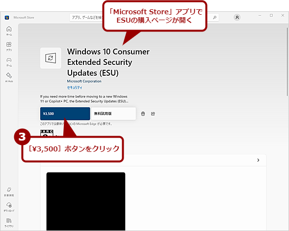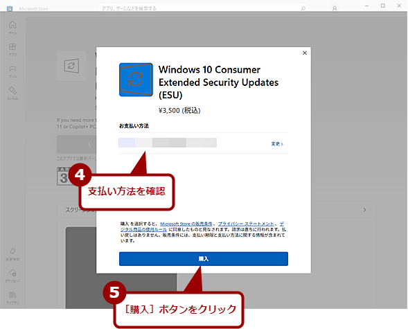 「Microsoft Store」アプリで「Windows 10 Consumer Extended Security Updates (ESU)」ページが開くので、ここの[\3,500]ボタンをクリックし、「Microsoft Store」アプリに登録しているクレジットカードなどで支払いを済ませば、「Microsoft Store」アプリにサインインしているMicrosoftアカウントに対しESUが有効化される。