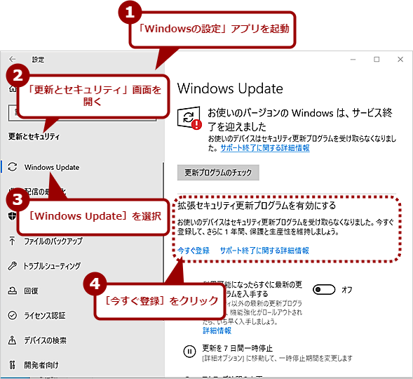 [更新とセキュリティ]−[Windows Update]を選択して、「Windows Update」画面を開くと、ローカルアカウントでサインインしている場合でも「拡張セキュリティ更新プログラムを有効にする」欄が表示されているはずだ。