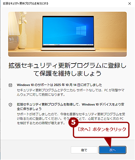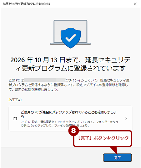 また、ローカルアカウントでサインインしていても、「Windows Update」画面の「拡張セキュリティ更新プログラムを有効にする」欄で[今すぐ登録]リンクしてウィザードを進めると、既にバックアップされていると表示され、無料でESUの登録ができることがある(サインインに使用したMicrosoftアカウントで既に設定のバックアップが実行されていることがあるため)。