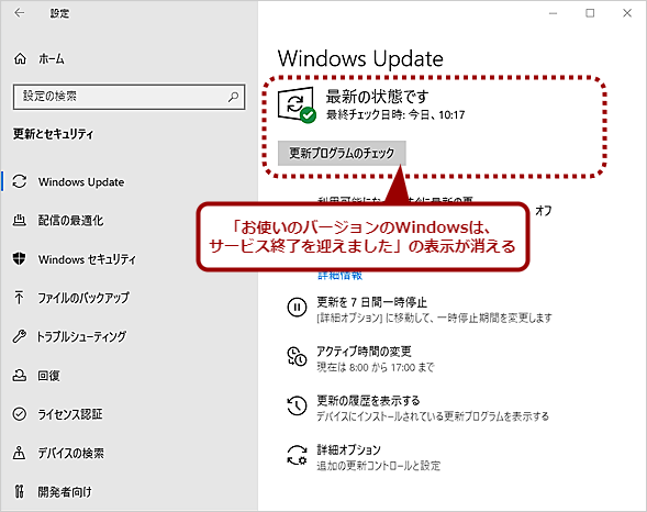 ただし、この時点でサインインアカウントがローカルアカウントからMicrosoftアカウントに切り替わってしまうようなので注意してほしい。ローカルアカウントによるサインインに戻してしまうと、「Windows Update」画面に「Windows Update」画面上部の「お使いのバージョンのWindowsは、サービス終了を迎えました」と表示されることから、更新プログラムの提供が受けられなくなるようだ。
