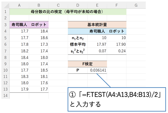 母平均が未知の場合、F.TEST関数を使えば簡単にP値が求められます。ただし、F.TEST関数は両側確率を返すので、片側検定の場合は得られた値を2で割る必要があります。