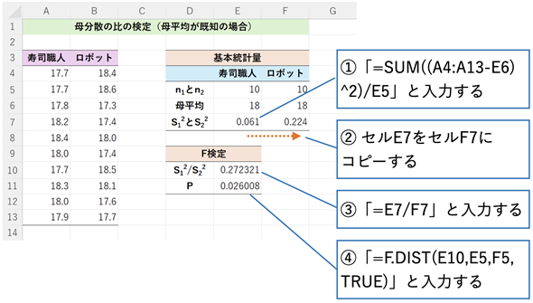 図2で見たように、母平均が未知の場合、詳細な計算の方法を知らなくても、F.TEST関数を利用するだけで母分散の比の検定(以下、F検定と呼びます)ができてしまいます。しかし、検定統計量Tを求め、F分布を基にP値を求める方法も知っておきたいですね。