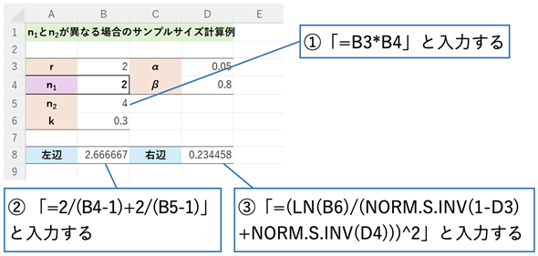 r=2の場合、n1≈ 14,n2≈28という結果が得られます(余裕を見て、n1=15,n2=30としておくといいでしょう。なお、n1=n2の場合はセルB3に1と入力しておきます。