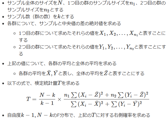 T, p = levene(x, y, center='median') # ブラウン・フォーサイス検定