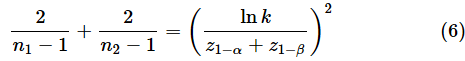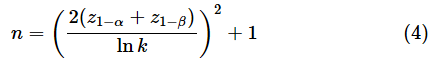 最後に、適切なサンプルサイズの求め方を見ておきます。ここでは、理屈抜きに、標準正規分布を使って近似値を求めるための式を示しておきます。有意水準をα、検出力を1−βとし、効果量を分散の比k=σ12/σ22としたとき、母平均が未知の場合は以下の式を使います。