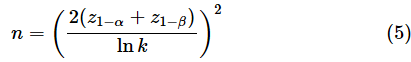 z1−αは標準正規分布の1−α点の値です(両側検定の場合はz1−α/2とします)。また、lnは自然対数です。