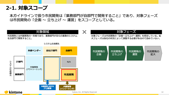 サイボウズはこれらの課題について「市民開発の特徴を踏まえて対処することで、会社としてのガバナンスを効かせた市民開発の体制を整えることができる」としており、事例を踏まえた実践的な内容として本ガイドラインをまとめたという。