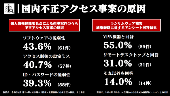 個人情報保護委員会のデータでは、指導案件の不正アクセス原因として、「ソフトウェアの脆弱(ぜいじゃく)性」「アクセス制御の設定ミス」「ID・パスワードの脆弱性」の3点が主要因として挙がっている。ただし、1つの事案で複数の原因が該当する場合があり、合計が100%を超えることもある点には注意が必要だ。