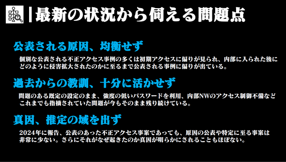 これらの問題点に対し、根岸氏は「侵入後の内部の対策次第では、被害は最小限にできるはず。そこに目を向けられていないのは深刻だ」と懸念を示す。辻氏も「公表事例は『最初とお尻しか言っていない』ことが多い。大きな事案における第三者委員会の報告書のようなものならば詳細に書かれていることもあるが、それが教訓として広く展開されていない」と現状を憂う。