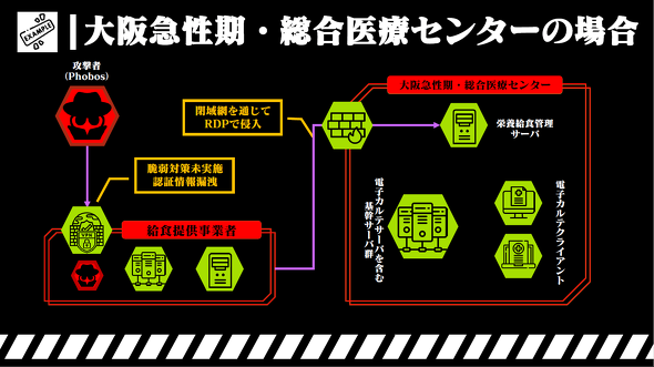 2022年10月に発生したこの事例では、攻撃者はまず、病院が業務委託していた給食提供事業者のVPN機器の脆弱性を悪用し、同事業者のネットワークに侵入した。その後、この事業者と病院をつなぐ閉域網を介し、リモートデスクトップで病院のネットワークに侵入した。