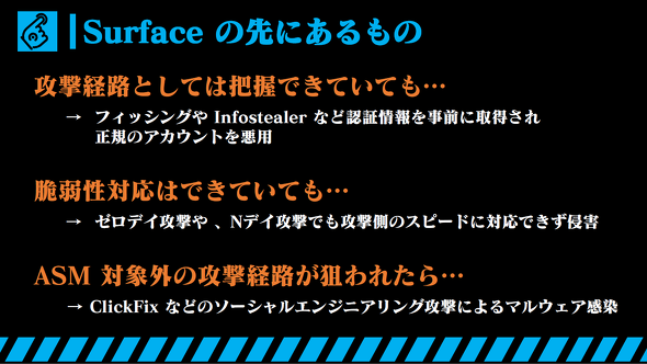フィッシングやインフォスティーラーなどにより、認証情報が窃取される被害が増加している。この場合、ASMで攻撃経路を把握し対策を講じていても、正規のアカウントでアクセスされると不正侵入を許してしまう。「正規のアカウントを使った不正アクセスという観点で経路を考え、認証情報が盗まれた場合、それに気が付けるかどうか」という視点での対策が求められる。