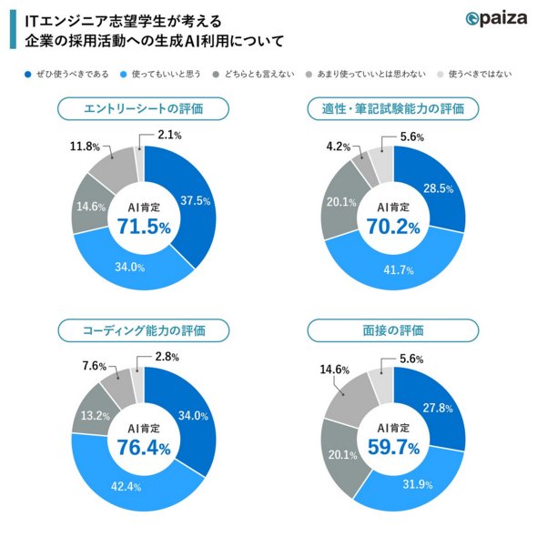 一方、面接の評価にAIを取り入れる点については、他の選考工程よりは慎重な姿勢が残った(59.7%がAI肯定)。paizaは「面接の評価に生成AIを導入する場合は、従来通り、人対人のコミュニケーションを共存させることが望ましい」としている。