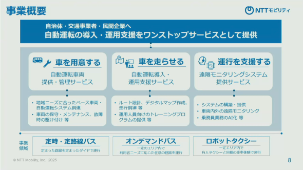 NTTグループ各社はこれまで、日本各地で35件の自動運転実験を実施してきた。新会社はこれを踏まえ、自治体や交通事業者による路線バス、オンデマンドバス、ロボットタクシーの運用をバックエンドで支えるサービスを提供する。全国で共通化したサービスを提供することによって、普及の壁となっているコストの課題を克服していきたいという。