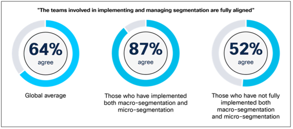 マクロセグメンテーションとマイクロセグメンテーションの両方を完全に実装している組織では、「チームが完全に連携している」と回答する割合は87%、完全に実装していない組織では52%だった。