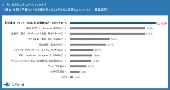 不審なメールの種類としては、「配送業者を装ったメール」が65.9%と最も多く、「通販・ECサイトを装ったメール」(57.8%)、「金融系を装ったメール」(57.5%)がこれに続いた。これらは日常的に利用する身近なサービス提供事業者をかたる傾向にある。