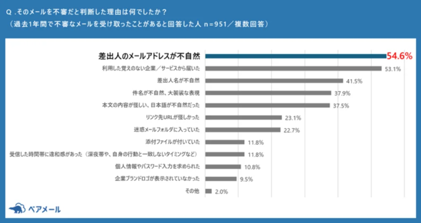 メールを不審だと判断した理由については、「差出人のメールアドレスが不自然」(54.6%)、「利用した覚えのない企業/サービスから届いた」(53.1%)、「差出人名が不自然」(41.5%)が上位を占めた。一方で、「件名が不自然、大袈裟な表現」(37.9%)や「本文の内容が怪しい、日本語が不自然だった」(37.5%)といった文面の違和感に関する回答は30%台にとどまった。