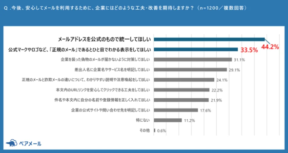 今後安心してメールを利用するために企業に期待する工夫としては、「メールアドレスを公式のもので統一してほしい」(44.2%)、「公式のマークやロゴなど、『正規のメール』であるとひと目で分かる表示をしてほしい」(33.5%)が上位に挙がった。