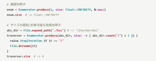 「Enumerator.produce」がオプションのキーワード引数「size」を受け付けるようになった。サイズには整数、Float::INFINITY、ラムダなどの呼び出し可能オブジェクト、または不明を示すnilを指定できる。
