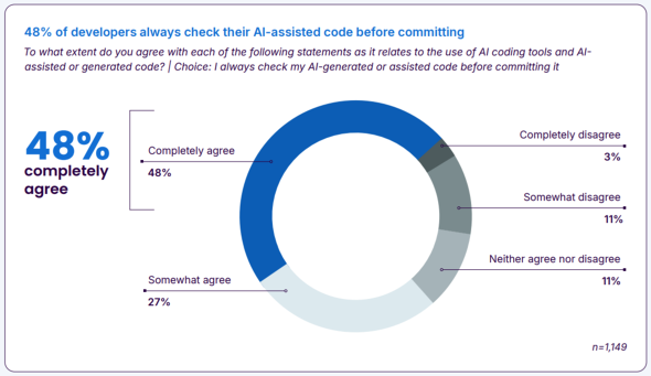回答者の96%が「AI生成コードが機能的に正しいとは完全には信頼していない」と答えており、95%の開発者がAIコードのレビューや修正に時間を費やしている。さらに38%は、AI生成コードのレビューは人間が書いたコードよりも手間がかかると感じている。