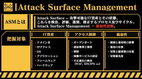 ASMにおける把握対象は、「IT資産」「アクセス制御」「脆弱性」の3つに分類できる。これらは単に並列に並んでいるわけではなく、この順番で見ていくことが極めて重要だ。